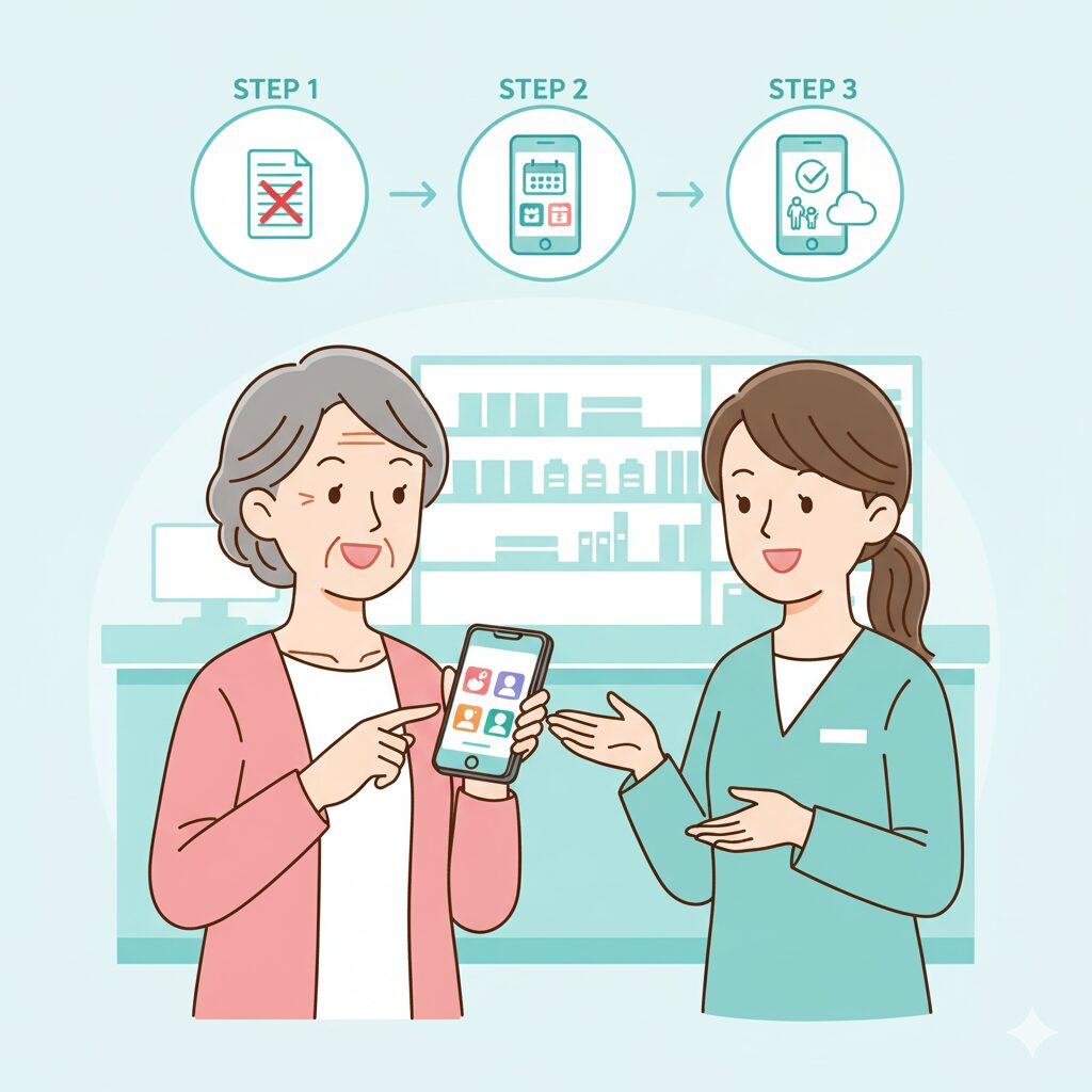 この記事では、シニアのあなたが「お薬手帳アプリ」を迷わず、安全に使い始めるための3ステップをご紹介しました。